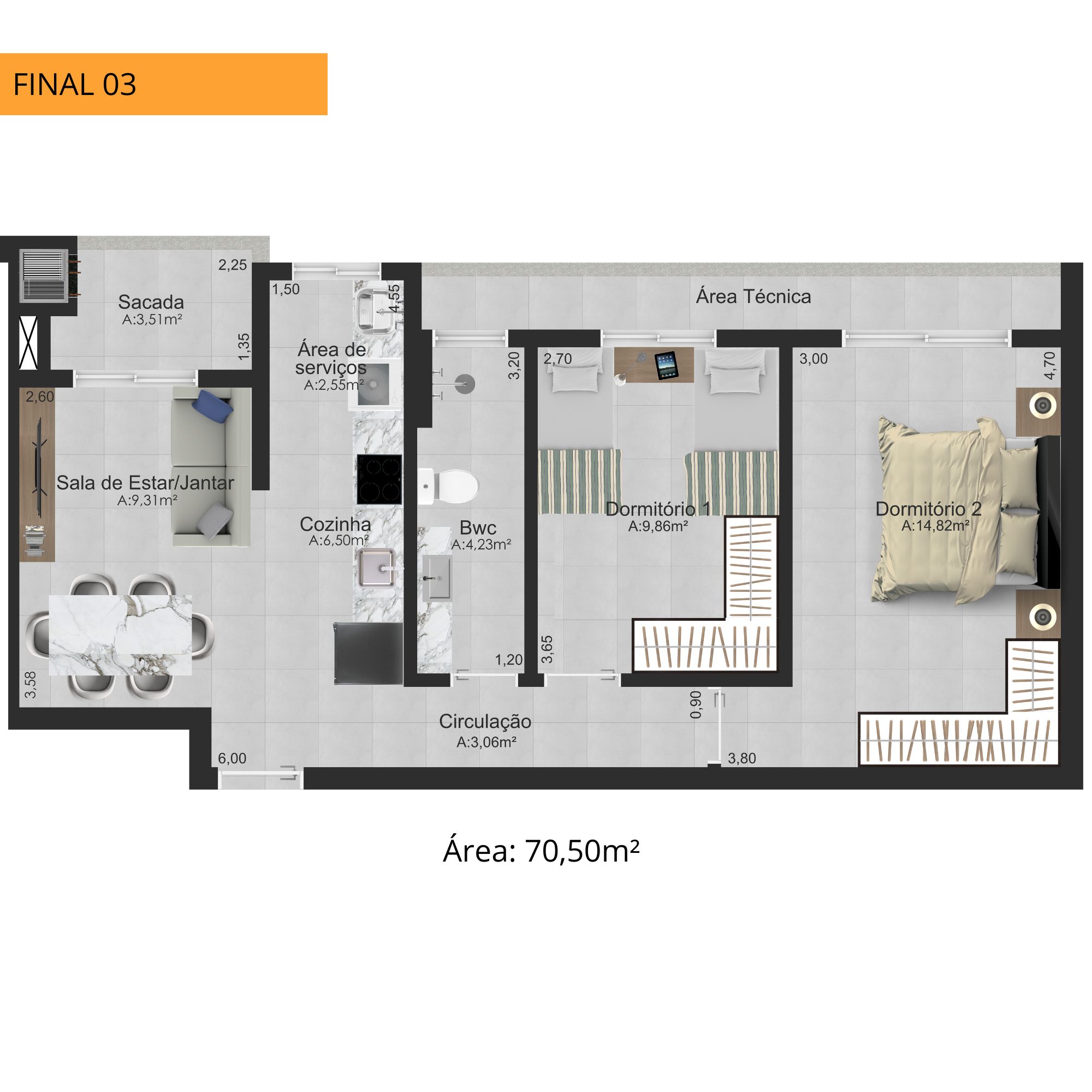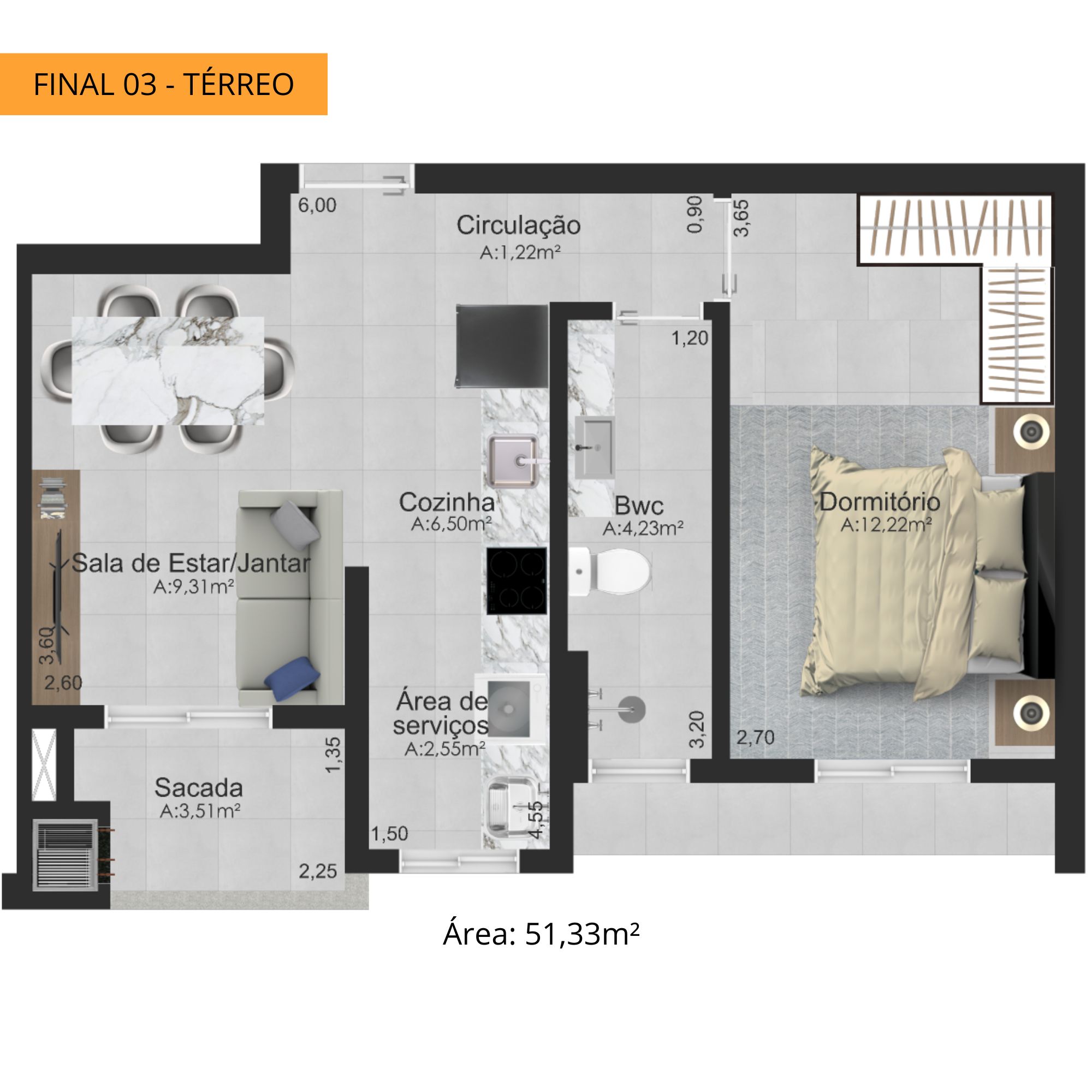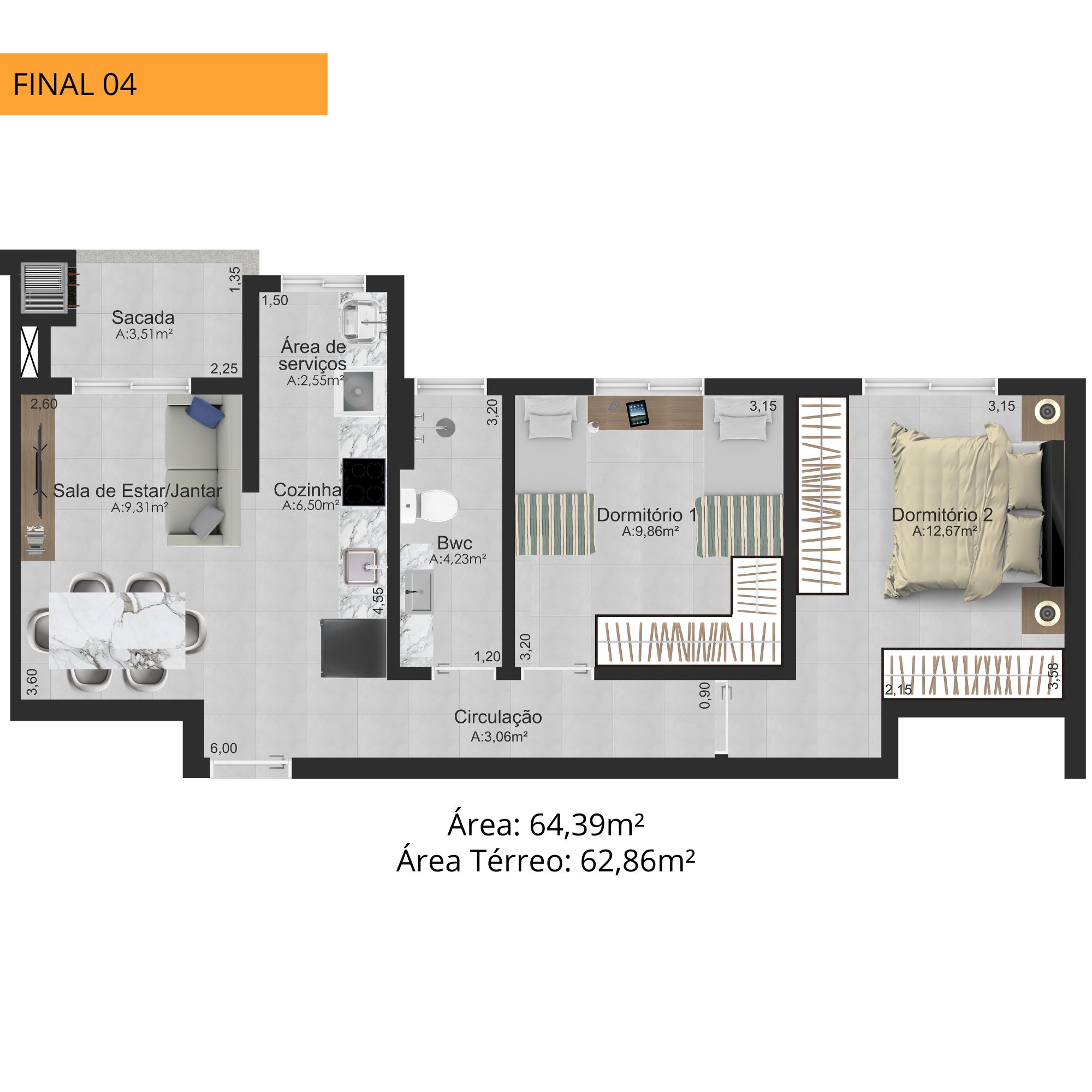 Os apartamentos são modernos e funcionais, com 2 quartos, 1 banheiro, sala e cozinha integradas, área de serviço e 1 vaga de estacionamento.