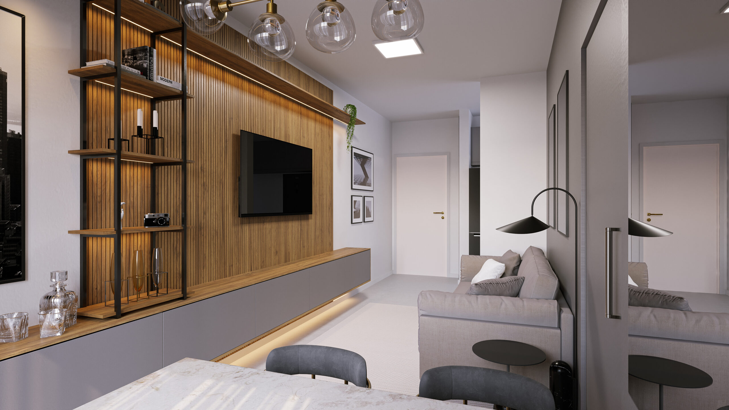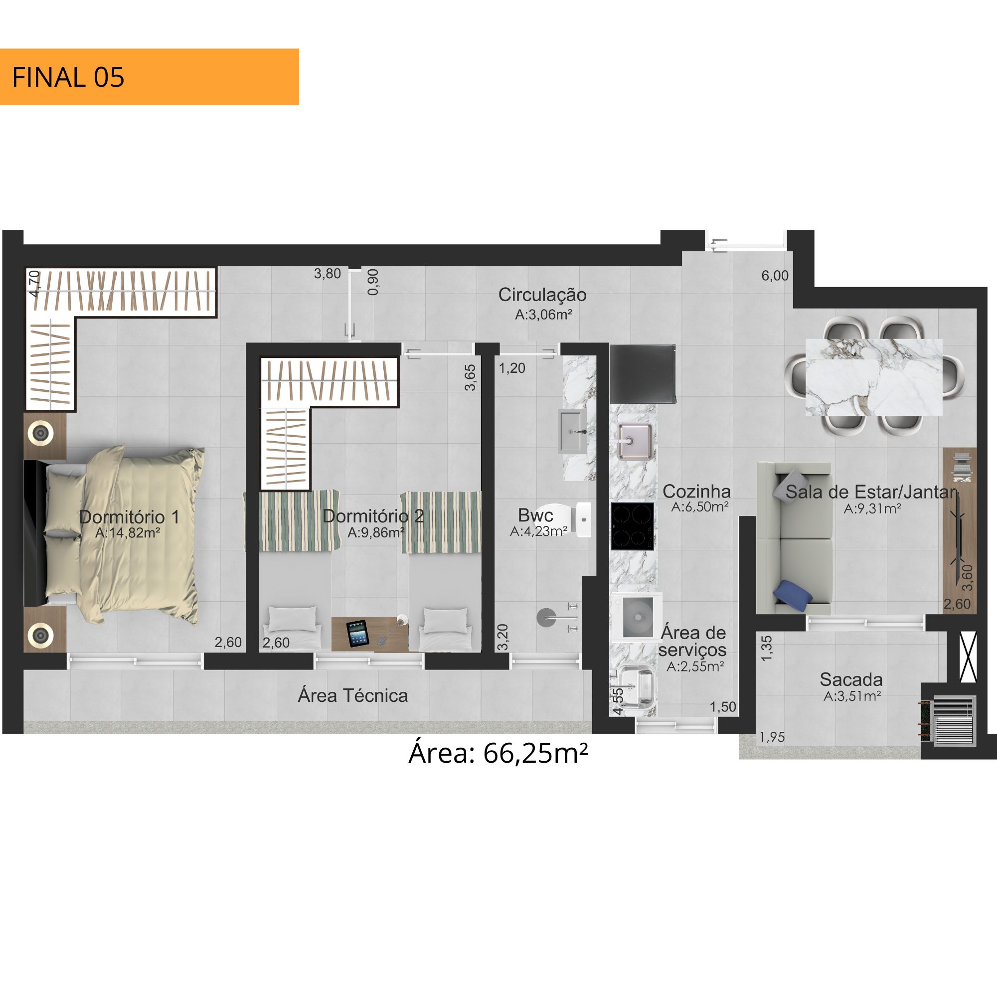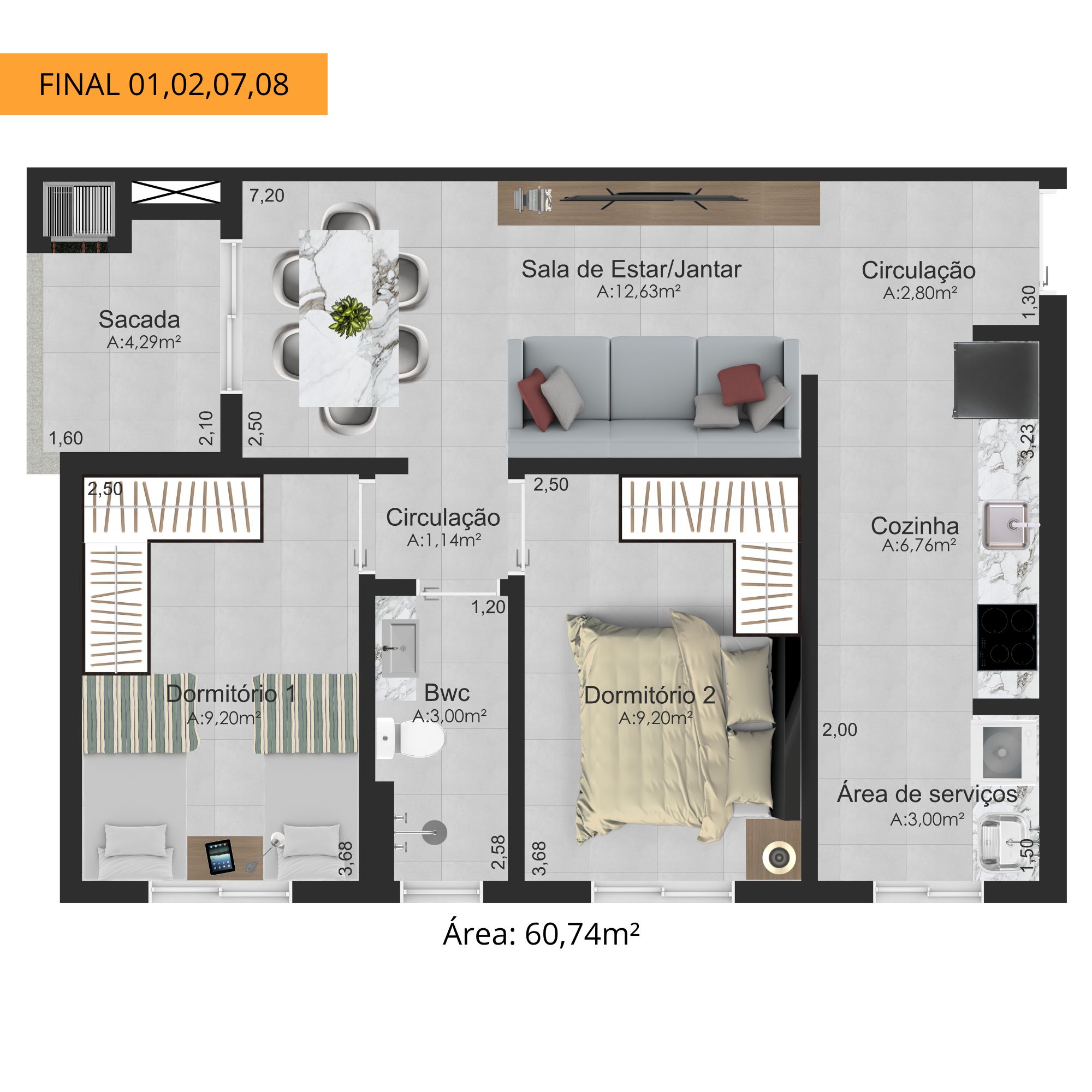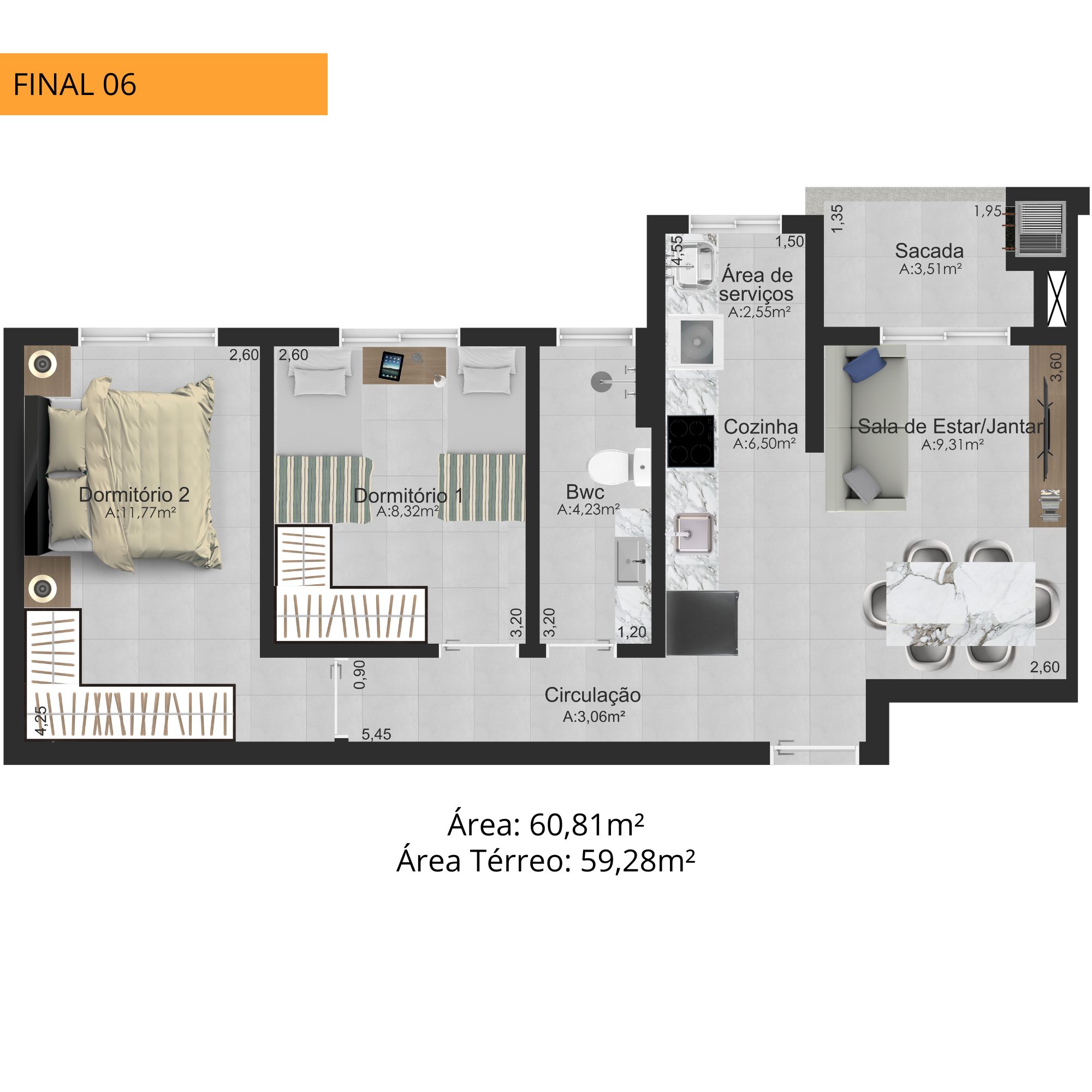 Os apartamentos são modernos e funcionais, com 2 quartos, 1 banheiro, sala e cozinha integradas, área de serviço e 1 vaga de estacionamento.